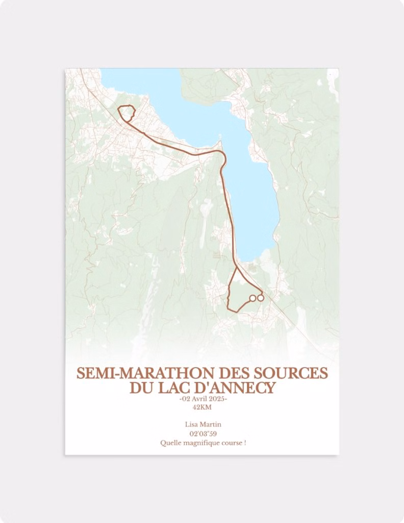 Nos créations sont pensées par des designers qui comprennent l’importance d’un chrono, d’un col, d’une ligne d’arrivée. Chaque visuel est épuré, juste, et personnalisé pour refléter ton parcours. Parce que ce que tu as fait mérite mieux qu’un souvenir flou ou qu’une médaille dans un tiroir.